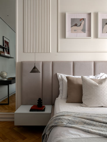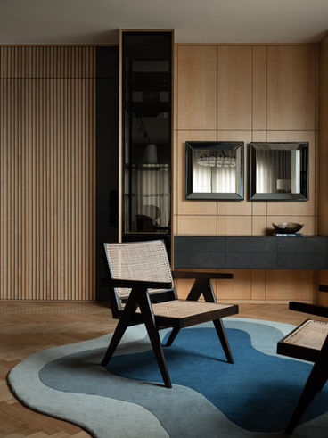Inspired by the enduring elegance of maple wood flooring, wooden wall panels, and intricate mouldings, complemented by bespoke furnishings, each space is meticulously crafted to impart both warmth and depth. The design thoughtfully integrates modernity with comfort, achieving a refined and inviting atmosphere that embodies sophisticated living.